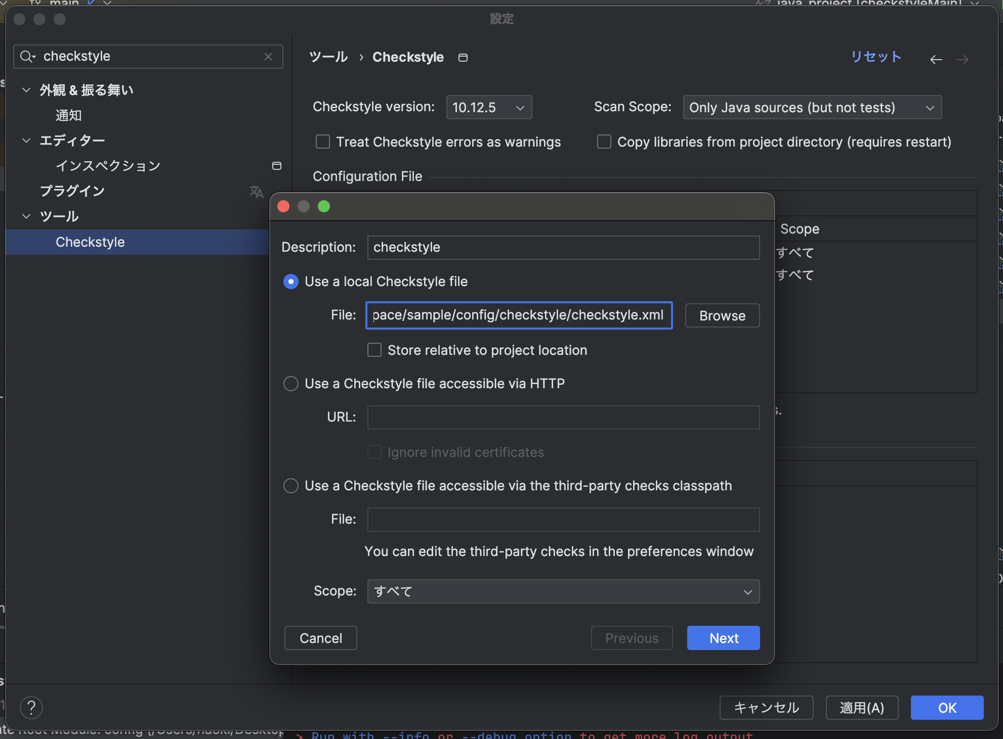 5. Descriptionに任意の名前を設定します。ラジオボタンのUse a local Checkstyle fileを選択します。Browseボタンをクリックし、手順2で配置したxml (root/config/checkstyle/checkstyle.xml) を指定します。Nextをクリックします。