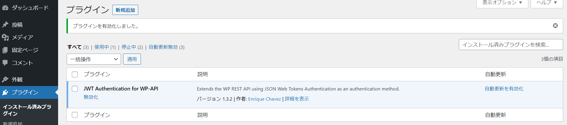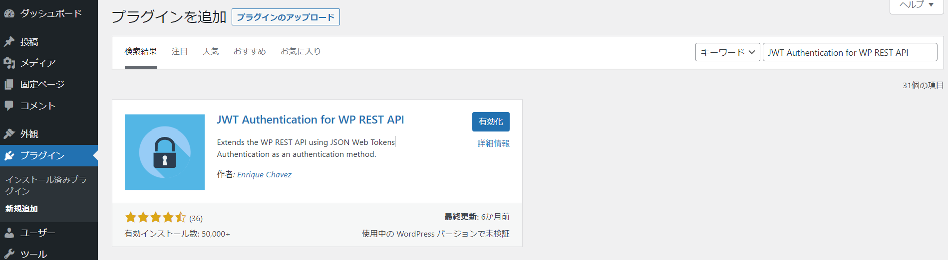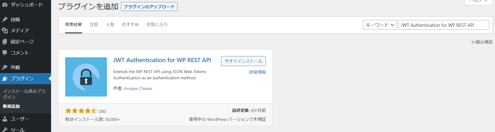 1. 管理画面の左サイドメニューの「プラグイン」を選択し、「新規追加」をクリックします。画面右上の検索欄に「JWT Authentication for WP REST API」を入力します。検索結果一覧に該当プラグインが表示されるので「今すぐインストール」をクリックします。