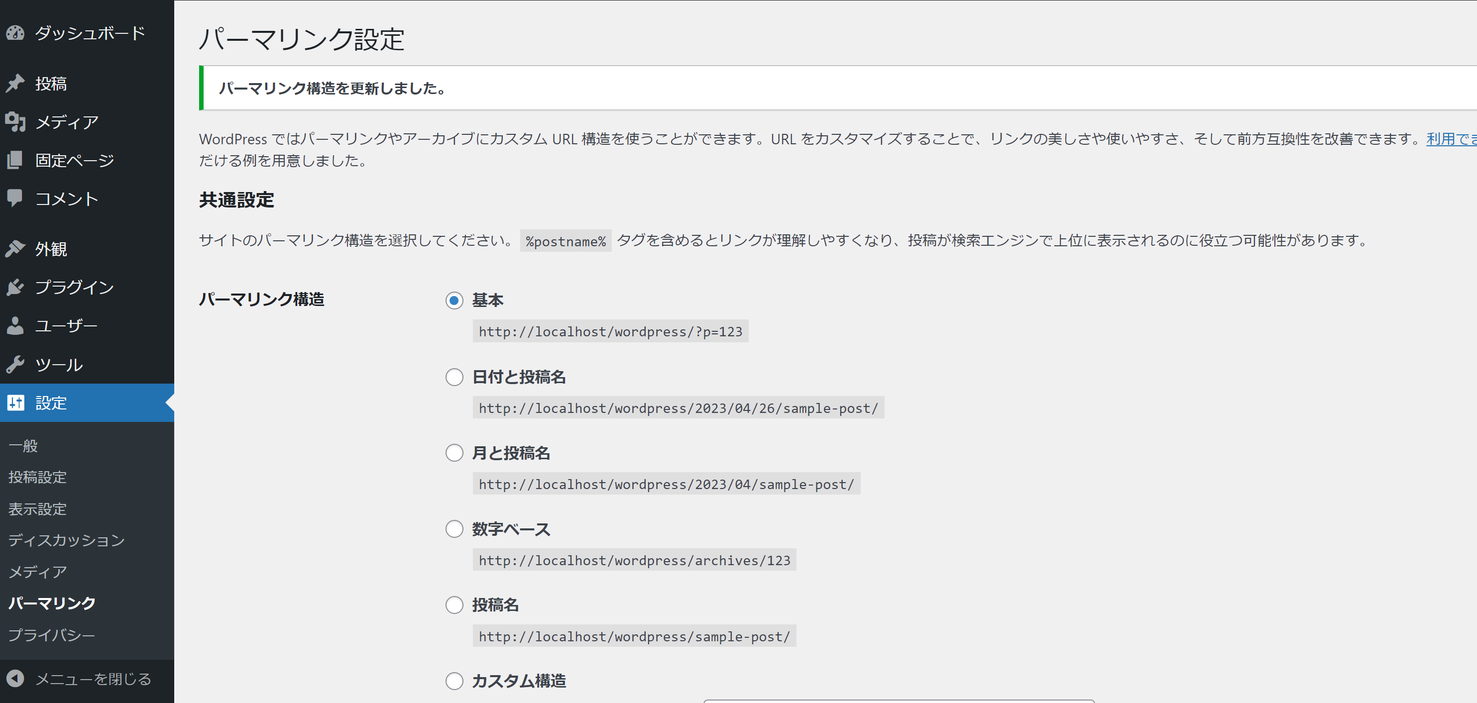 解決方法1. 管理画面の左サイドメニューの「設定」を選択し、「パーマリンク」をクリックします。「パーマリンク構造」で「基本」以外を選択し、「変更を保存」をクリックします。保存後に再度エンドポイントにアクセスし、ユーザー一覧を取得できているか確認します。