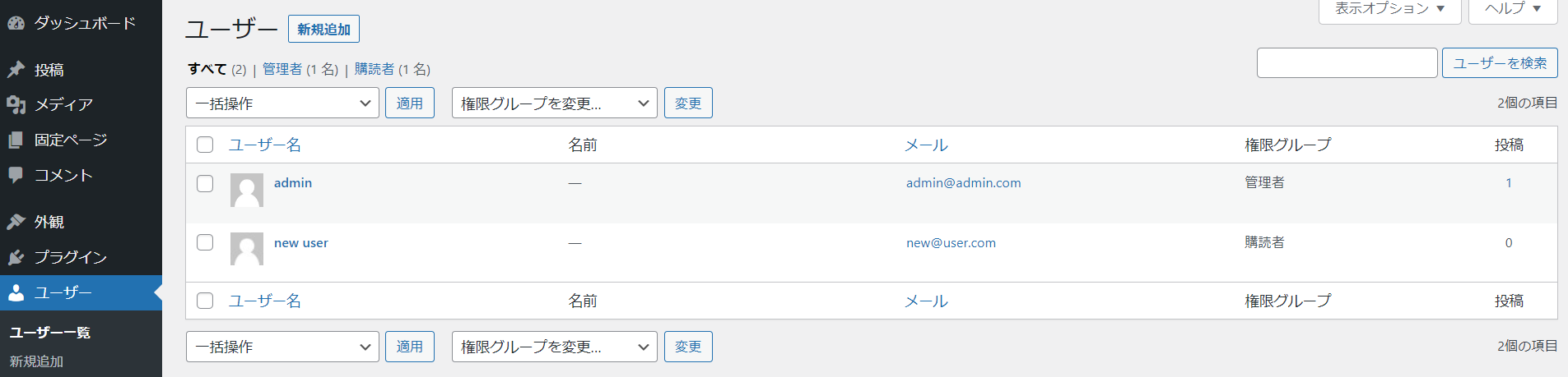 3. 管理画面の左サイドメニューの「ユーザー」を選択し、「ユーザー一覧」をクリックします。新規作成したユーザーが表示されていることを確認します。